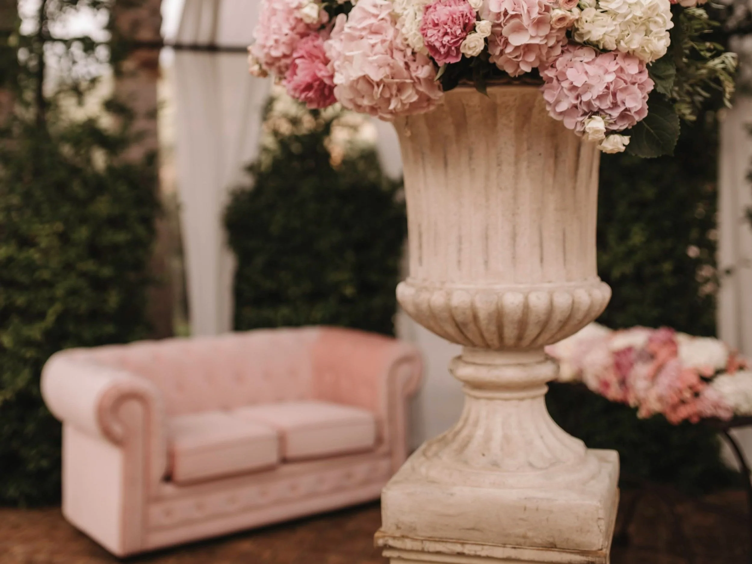 Sofá chester de color rosa, perfecto como complemento para el photocall de tu servicio de fotomatón o como decoración en la ceremonia.